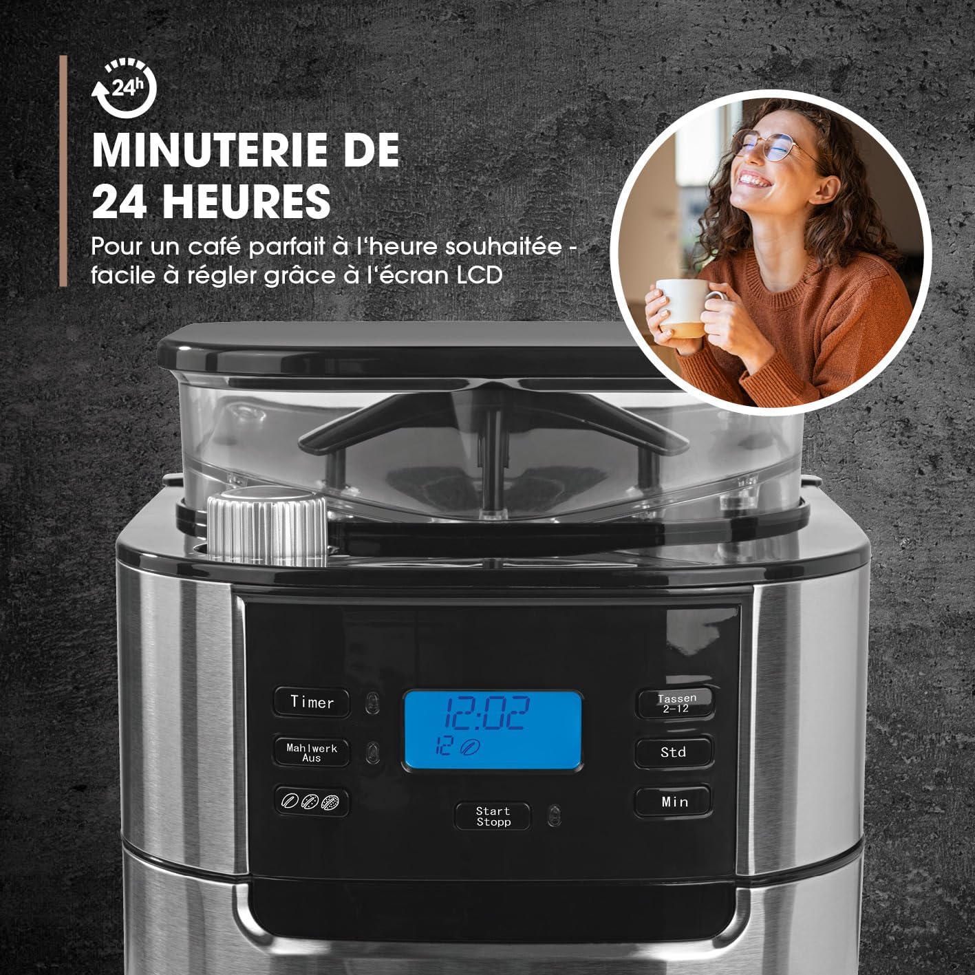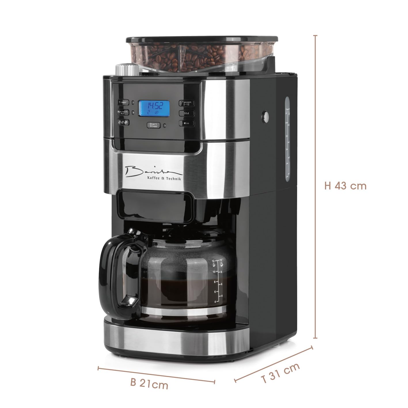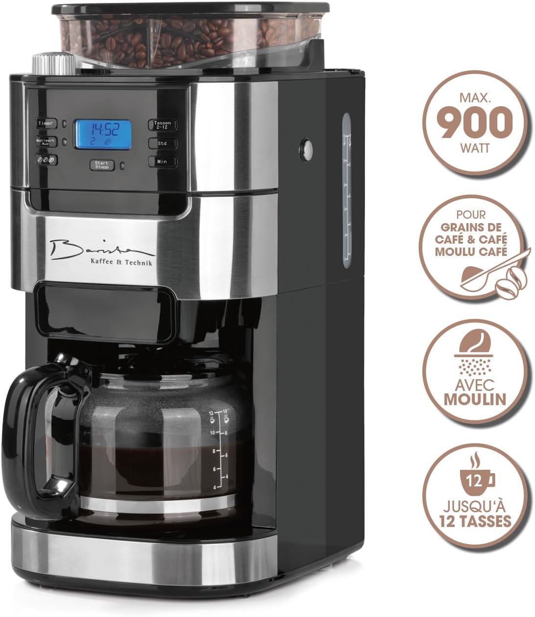 Barista Kaffee & Technik Cafetière Filtre avec verseuse erseuse en verre 1L pur 12 tasses de café, Machine a cafe grain avec broyeur et écran digital,