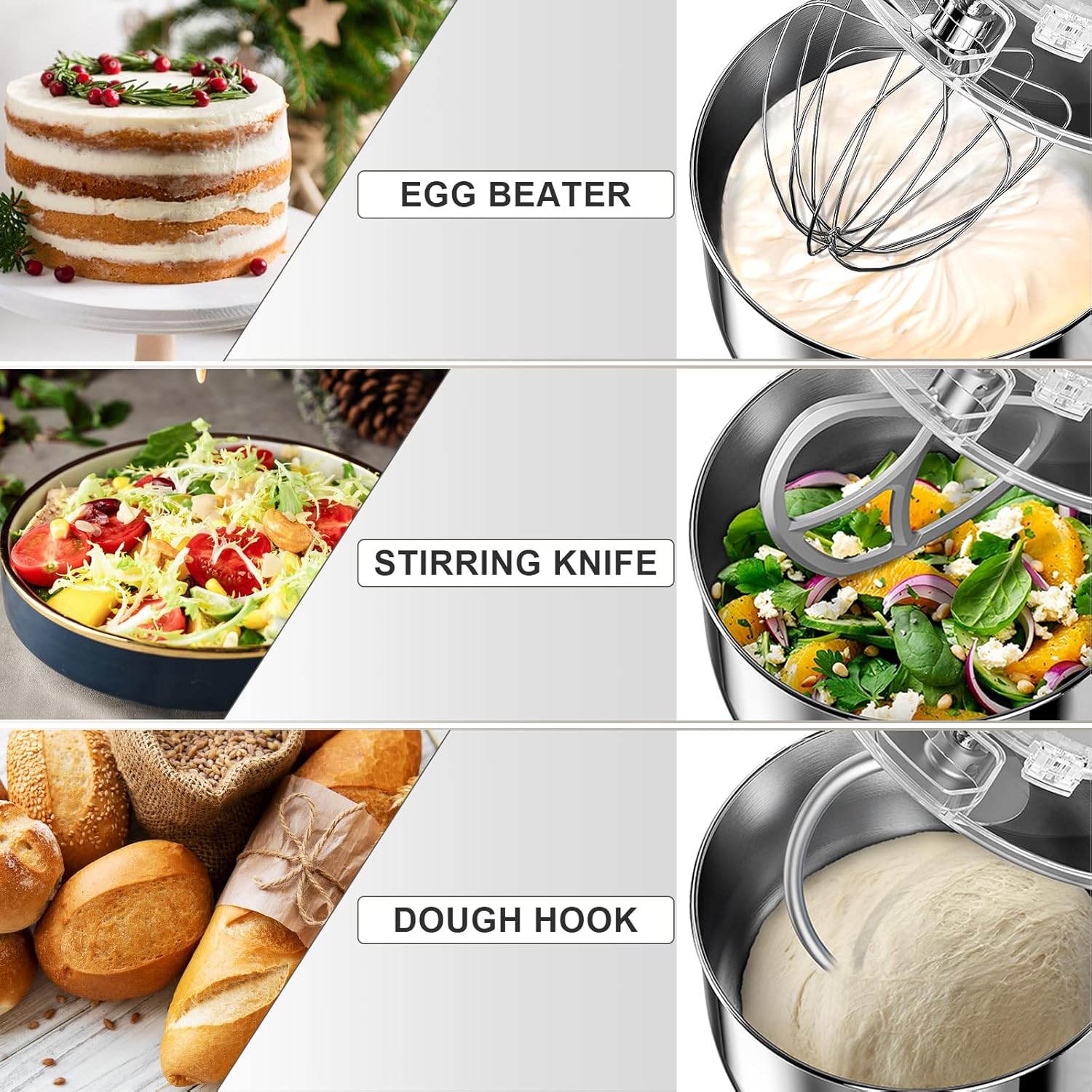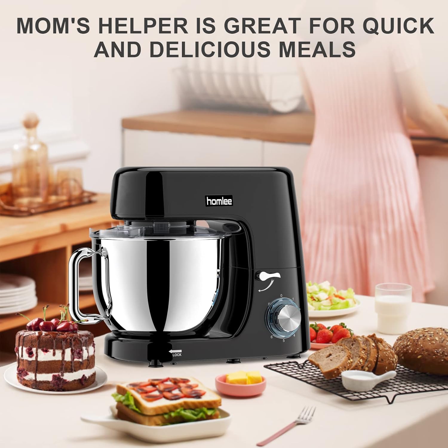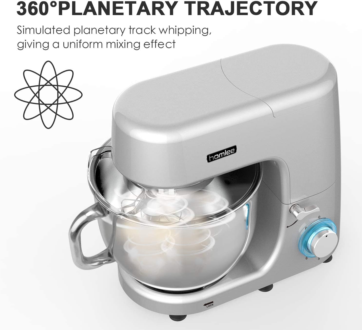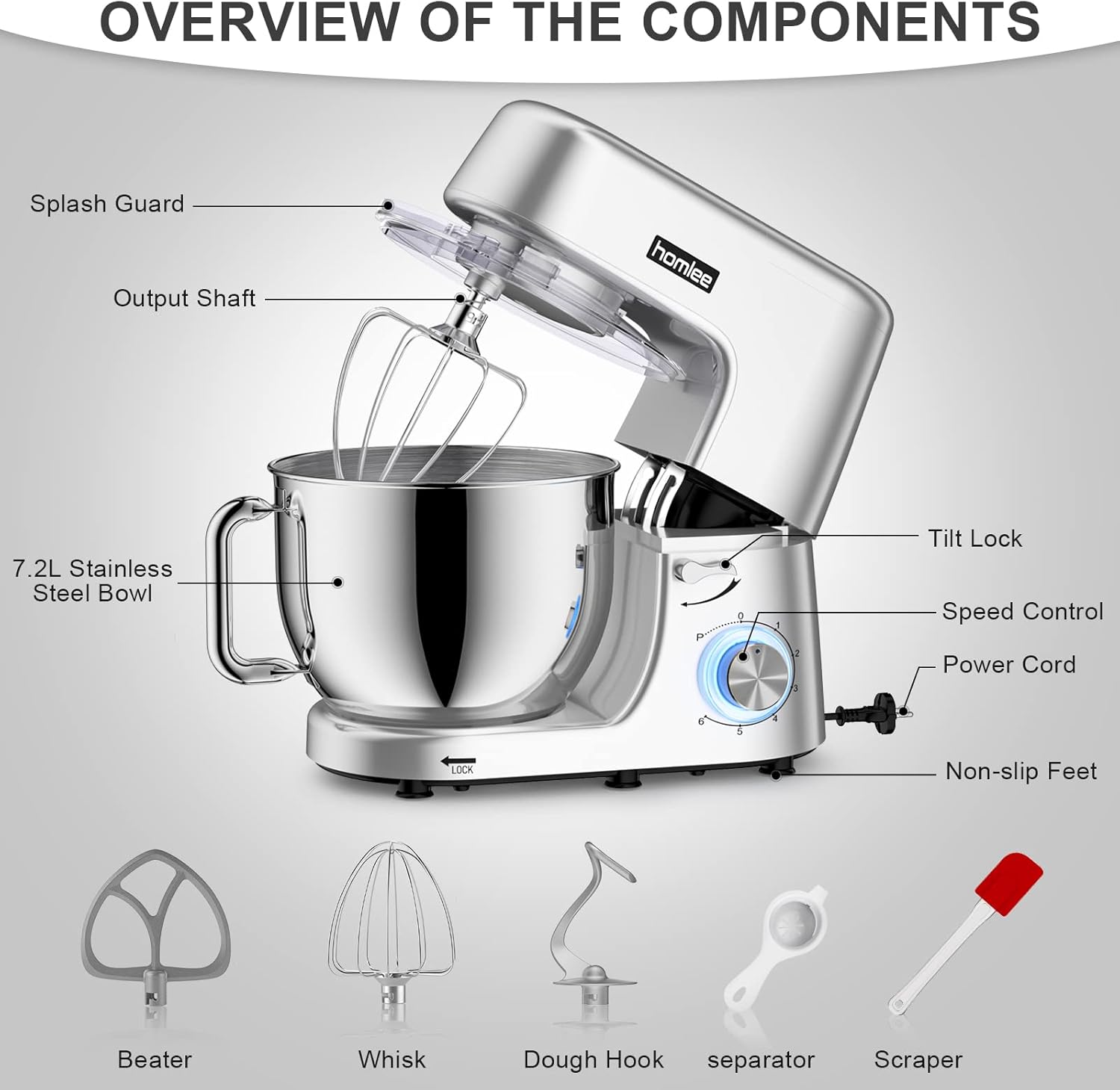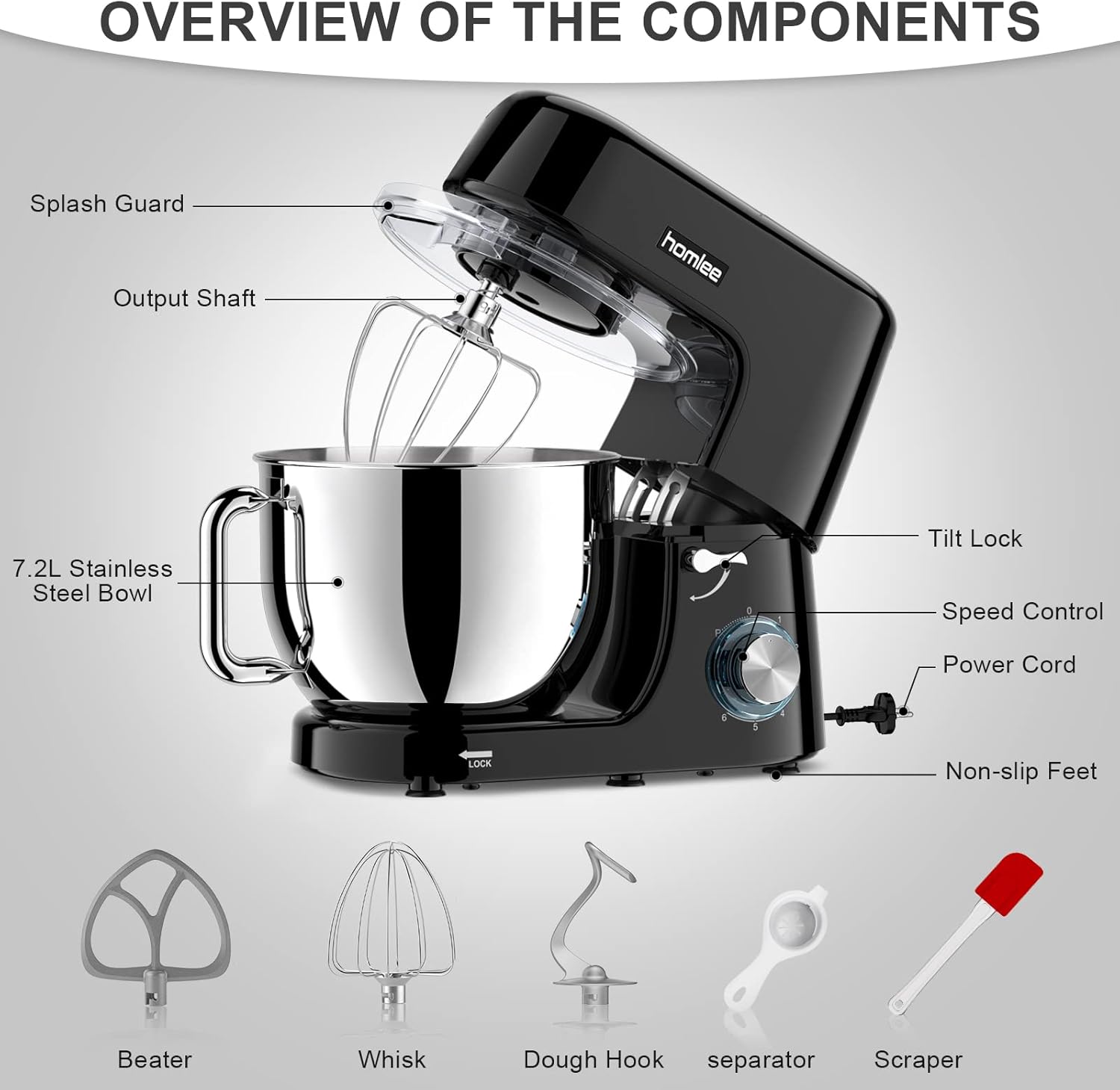 Robot Patissier Homlee 1800W 7,2L Professionnel Robot Ptissier Petrin Multifonctions Robot Cuisine Faible Bruit Batteur sur Socle avec Bol en Acier Inoxydable,Fouet,Batteur,Crochet,6 Vitesses