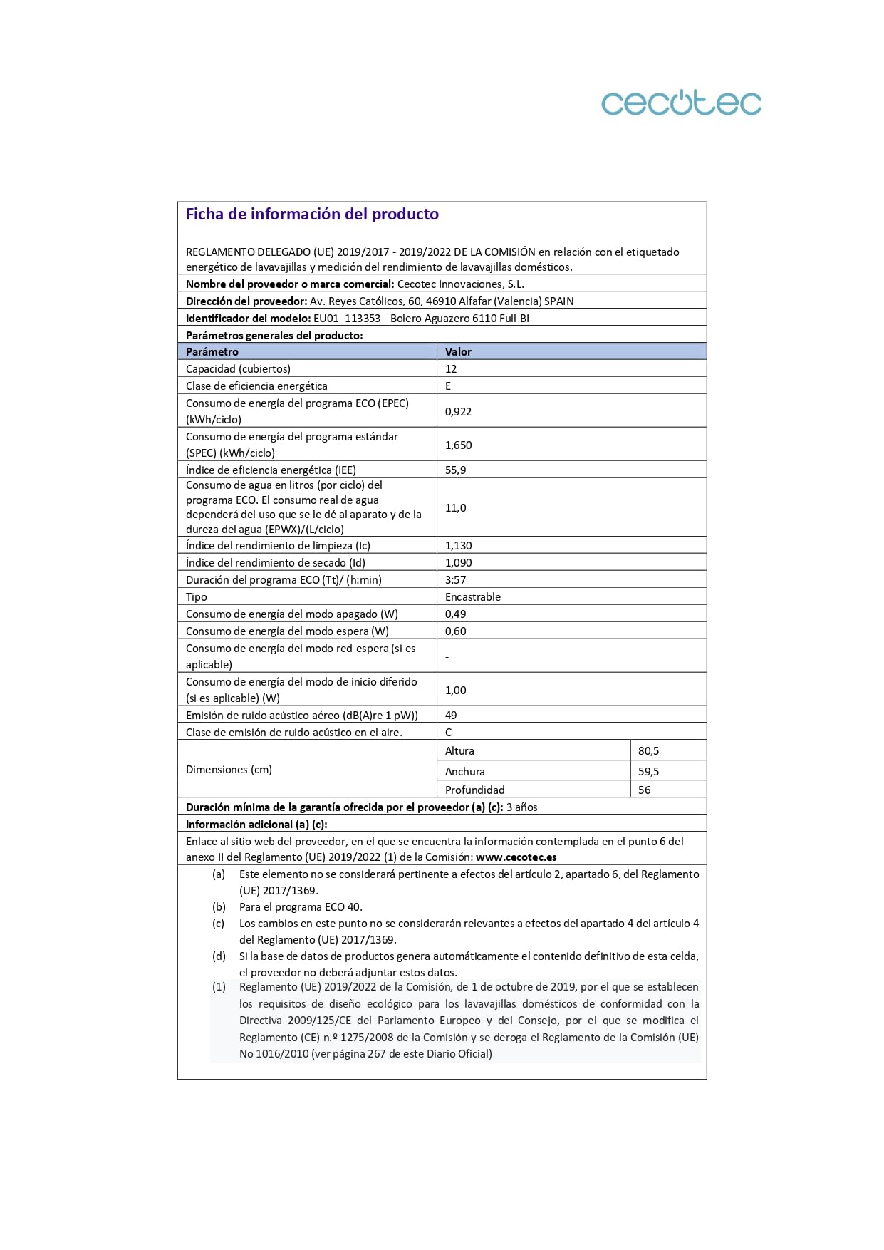 Cecotec Lave-vaisselle Intégrable 60cm Bolero Aguazero 6110 Full-BI. 1850W, 12 Couverts et 7 Programmes, Fonction Demi-charge, Programme 3 en 1, Dépar