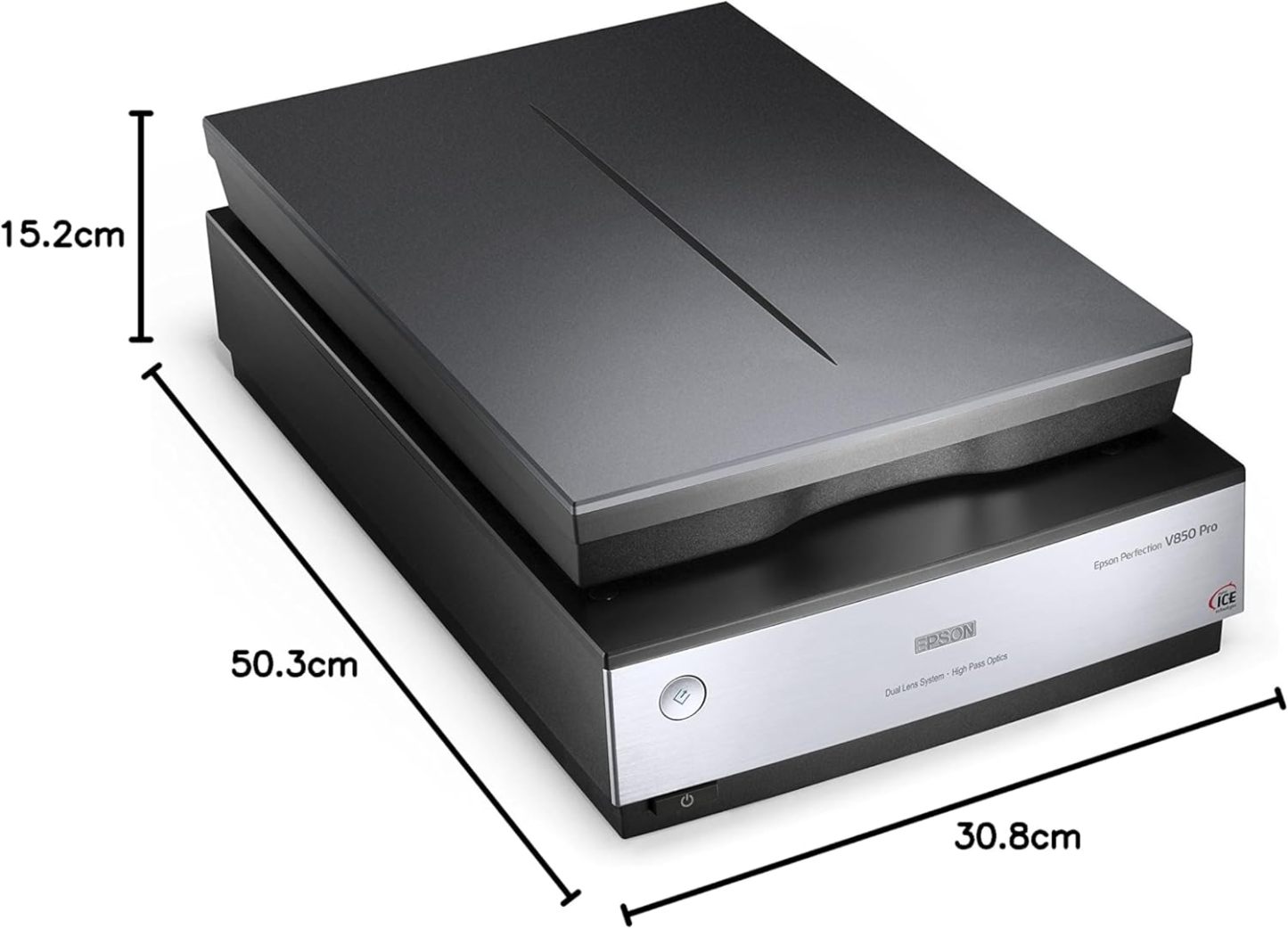 Epson Perfection V850, professioneller Fotoscanner, Scanner zum Digitalisieren von Fotos, Vorlagen, Dias und Negativen, Flachbettscanner mit hoher Auflösung, schwarz/silber