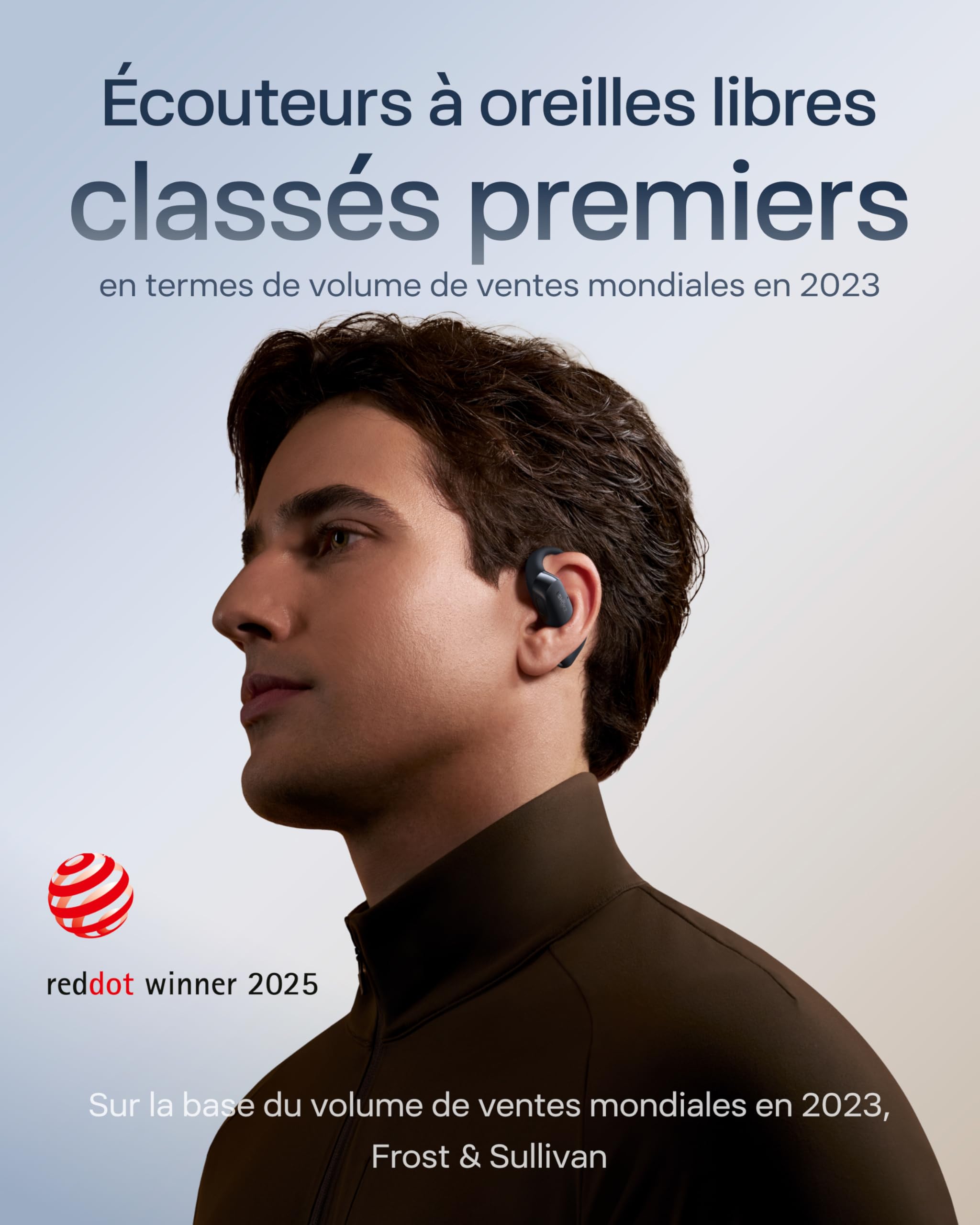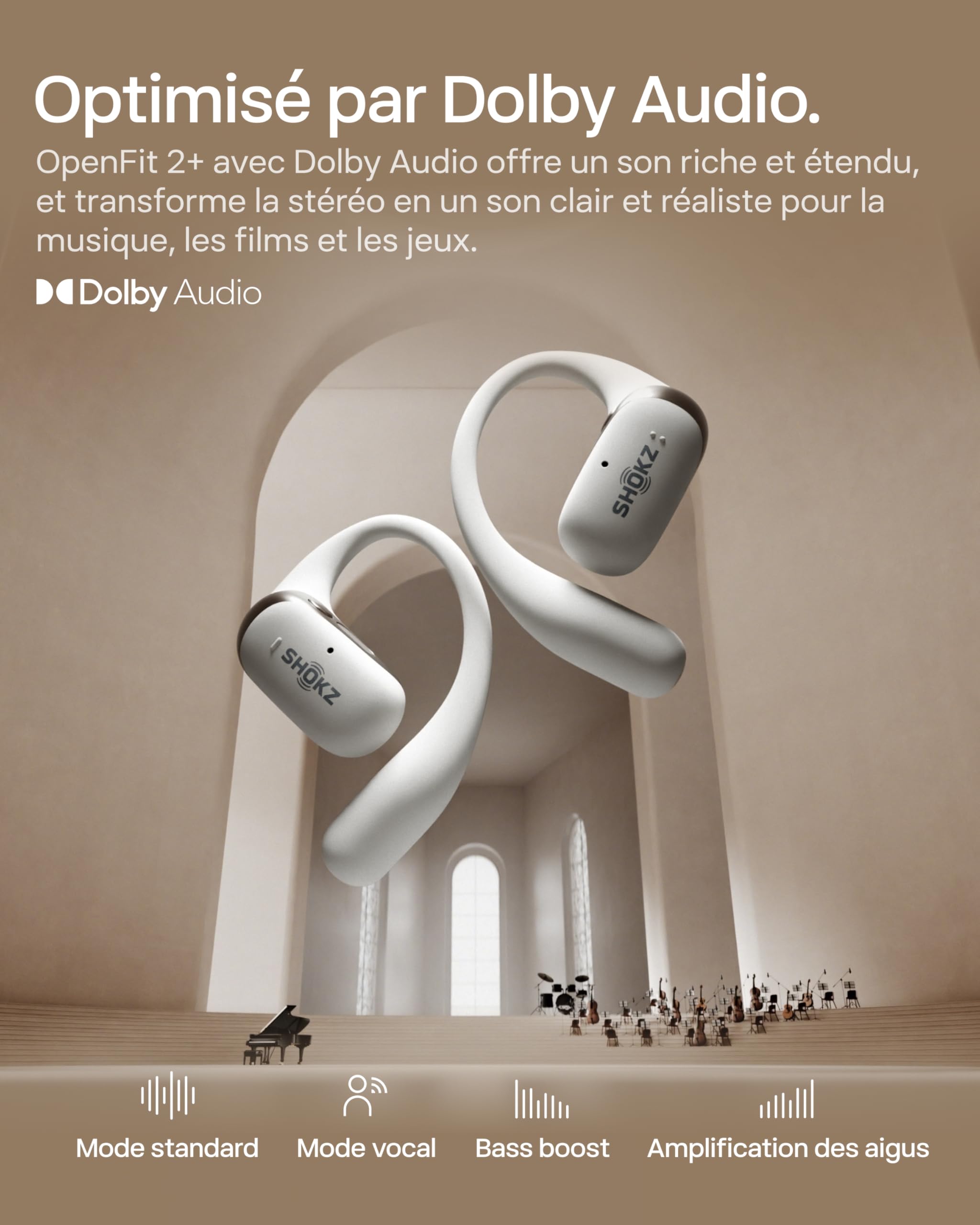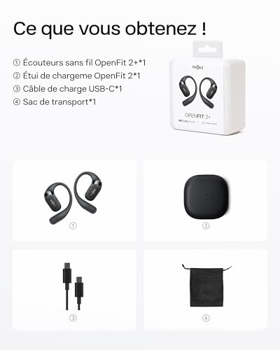 SHOKZ OpenFit 2+ Nouveaux Casques à Oreilles Libres, Dolby Audio, Crochets d’Oreille Souples, 48 Heures d’autonomie, résistance à l’Eau IP55, Recharge sans Fil, avec Sac de Transport, Noir