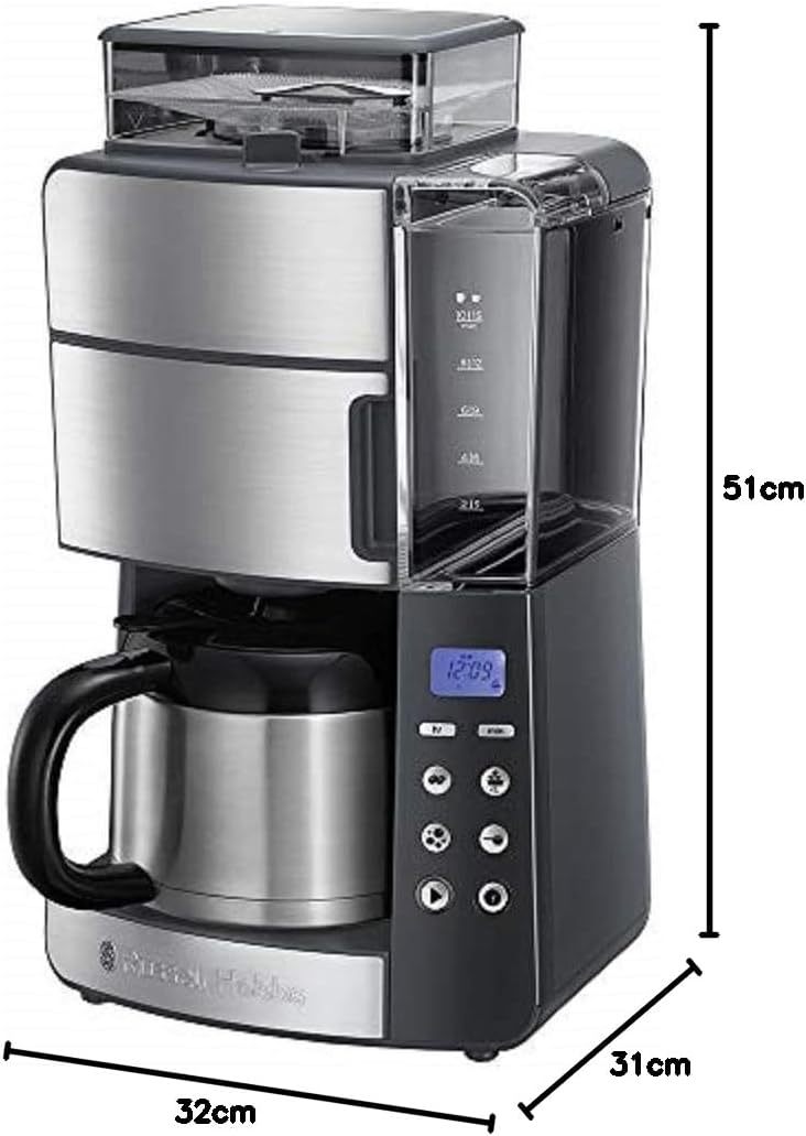 Russell Hobbs Kaffeemaschine mit Mahlwerk Thermokanne [Digitaler Timer, Brausekopf für opt. Extraktion & Aroma] Grind&Brew (max 10 Tassen, 3-stufige Mahlgradeinstellung) Filterkaffeemaschine 25620-56