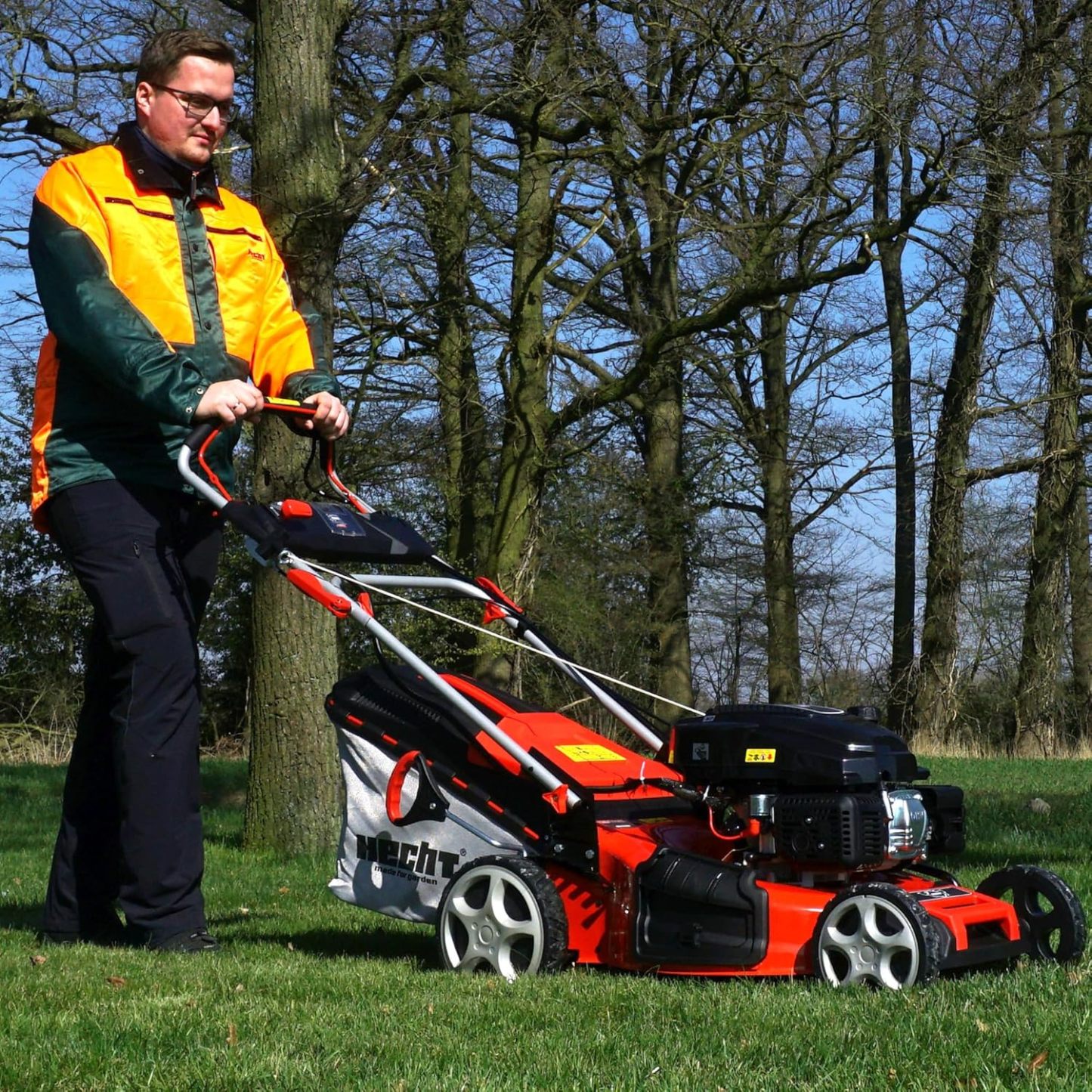 HECHT 5-IN-1 Benzin Rasenmäher – leistungsstarker 4 Takt Eco Motor 4,4 kW (6,0 PS) – Elektrostart – 53 cm Schnittbreite – 75 l Fangkorb – Radantrieb – patentierte Räder – Mulchmäher