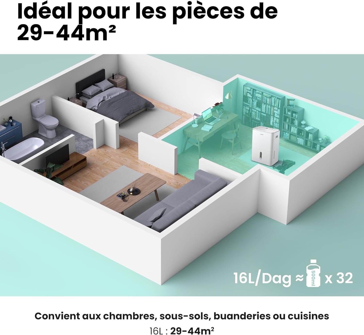 COMFEE' Déshumidificateur 2-EN-1,Elimine l'humidité jusqu'à 16L-Jour, Purification d'air avec ioniseur, 4 Modes, Fonction Air Swing, Contrôle APP, Idéal pour pièces de 29-44㎡, Easy Dry 16